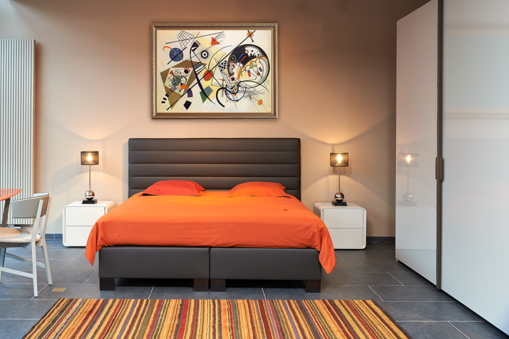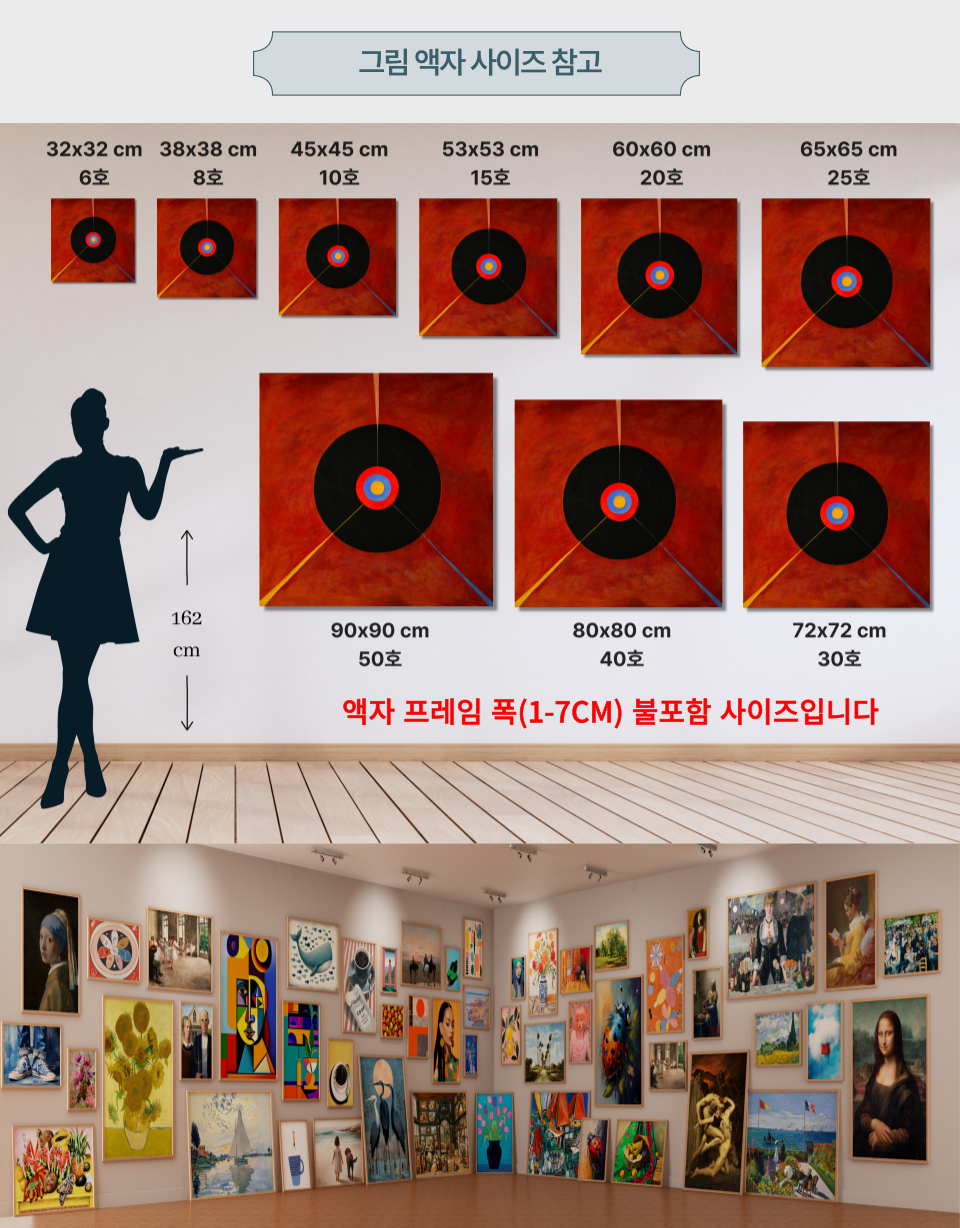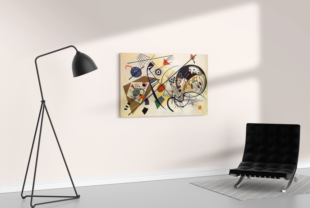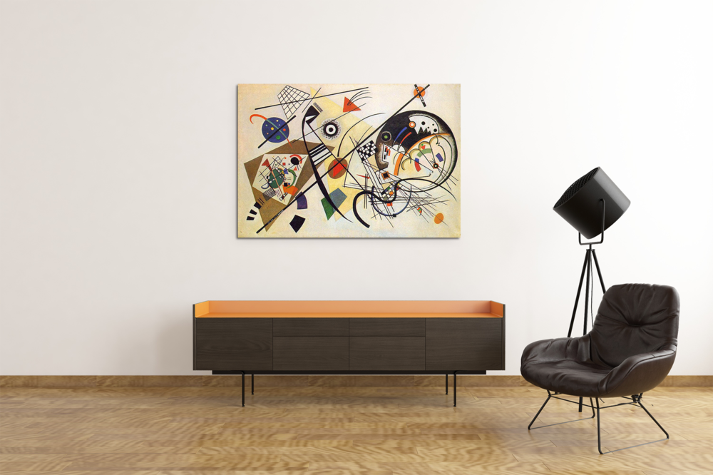언뜻 혼란스러워 보이지만 오히려 그 독특함을 낙관적으로 바라보게 됩니다. 원과 직선 등 다양한 도형과 포인트색은 밋밋한 공간을 독자적인 스타일로 꾸며줍니다. 색다른 분위기를 원한다면 이 그림을 걸어보세요.