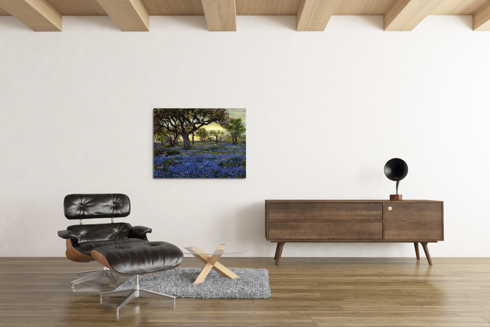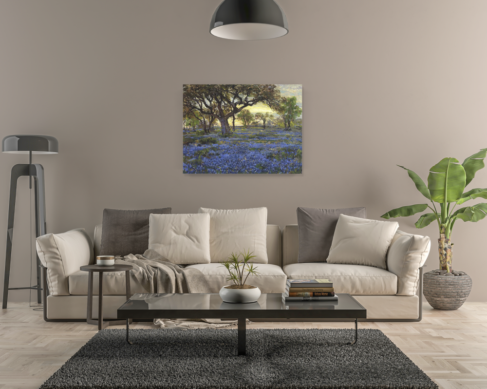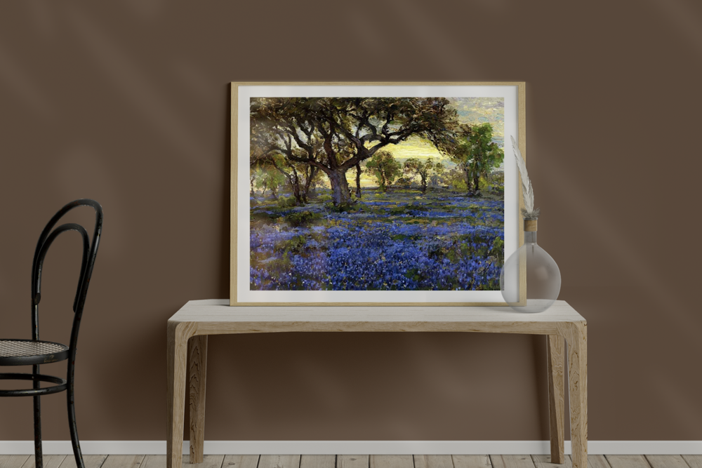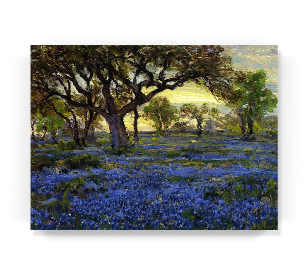오래된 참나무 풍부한 푸른색에서 샌 안토니오의 아름다움이 묻어나는 그림입니다. 쨍하지 않은 황혼의 푸른 빛에 차분해지면서도 무언가를 그리워하듯 아련해지네요. 블루보닛은 텍사스에서만 피어나는 야생화라고 해요. 이 그림으로 텍사스만의 어스름한 푸른 들판을 만나보세요.