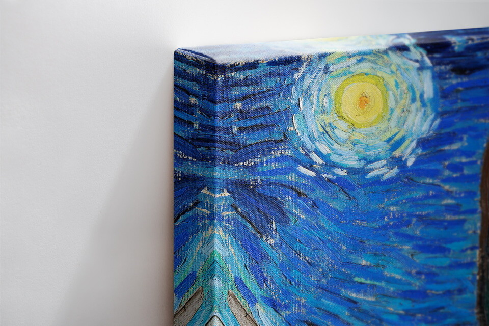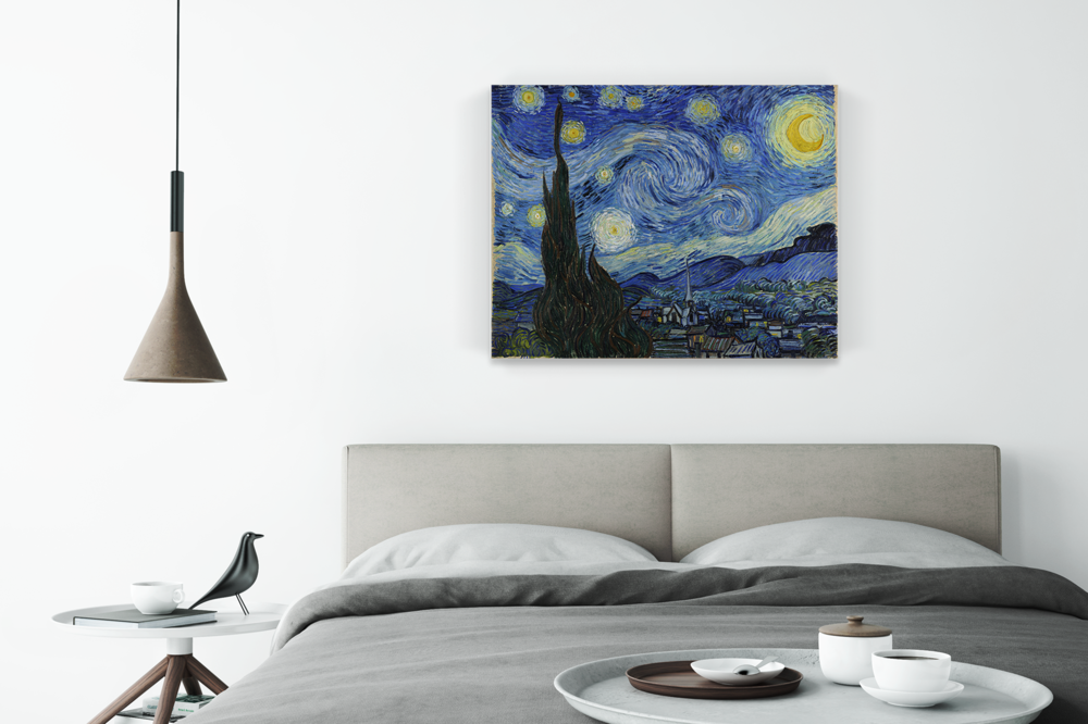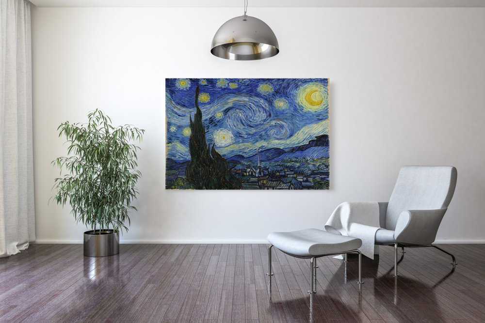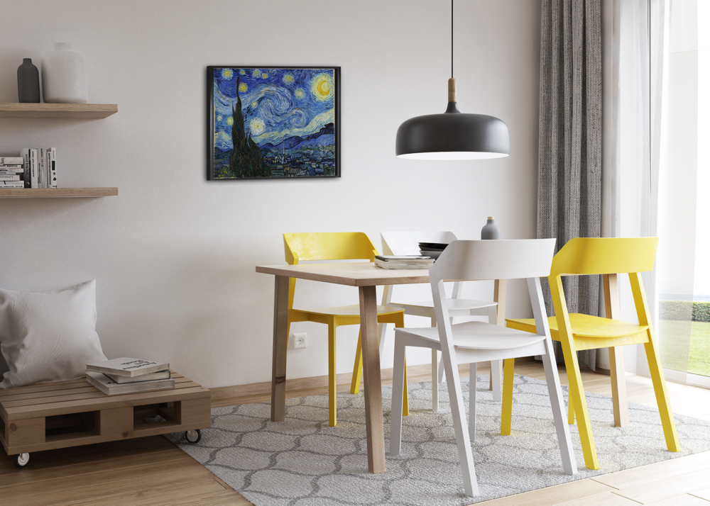 청회색 하늘에 소용돌이치듯 반짝이는 달과 별, 넘실대는 불꽃 같은 삼나무. 이 그림에는 격렬하게 끓어오르는 고흐의 감정이 그대로 표현됐습니다. 별과 밤하늘의 정경은 독특하고 환상적인 분위기를 자아냅니다. 어디에 걸어도 공간을 돋보이게 하는 걸작입니다.