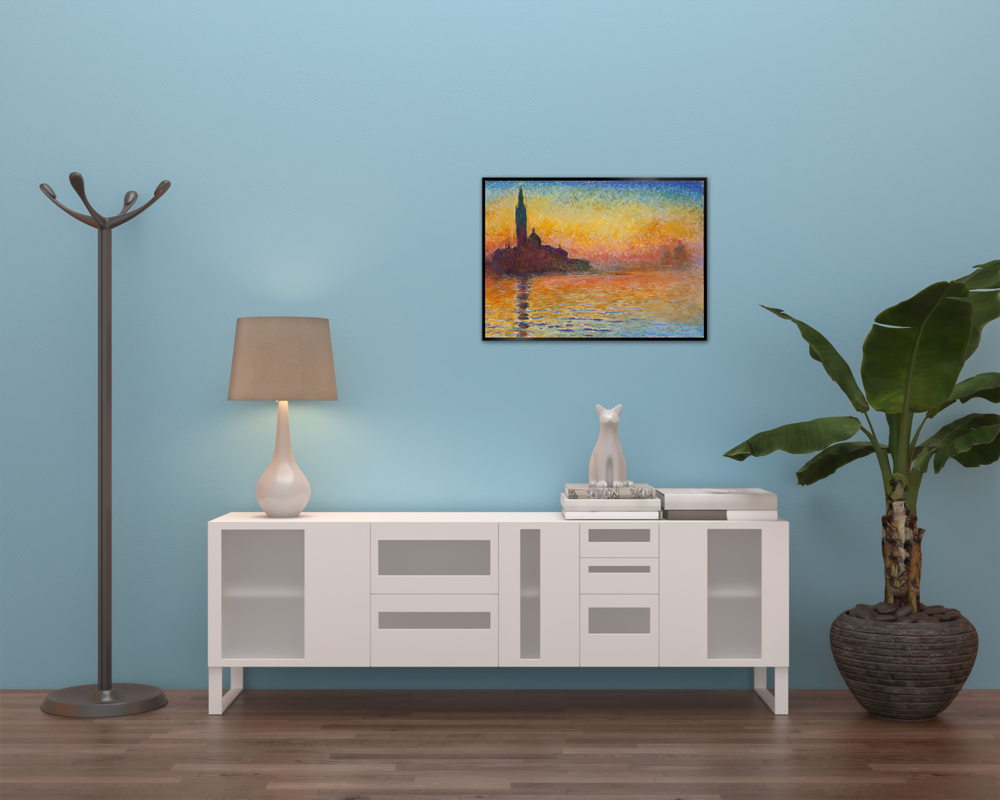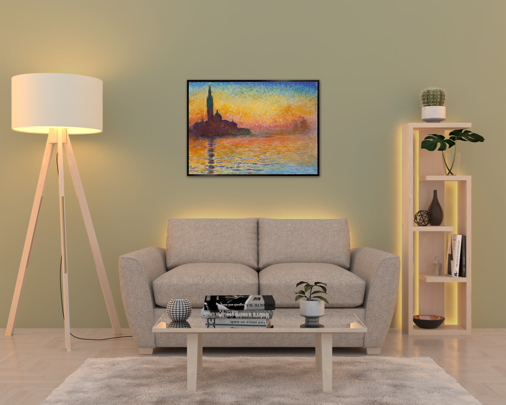 붉은색과 노란색, 푸른색이 섞인 그림은 일몰 때만 느낄 수 있는 신비로움을 잘 표현하고 있습니다. 부드러운 붓터치에서는 차분하면서도 열정이 느껴집니다. 이제 내 방에서도 아름다운 일몰을 느껴보세요.