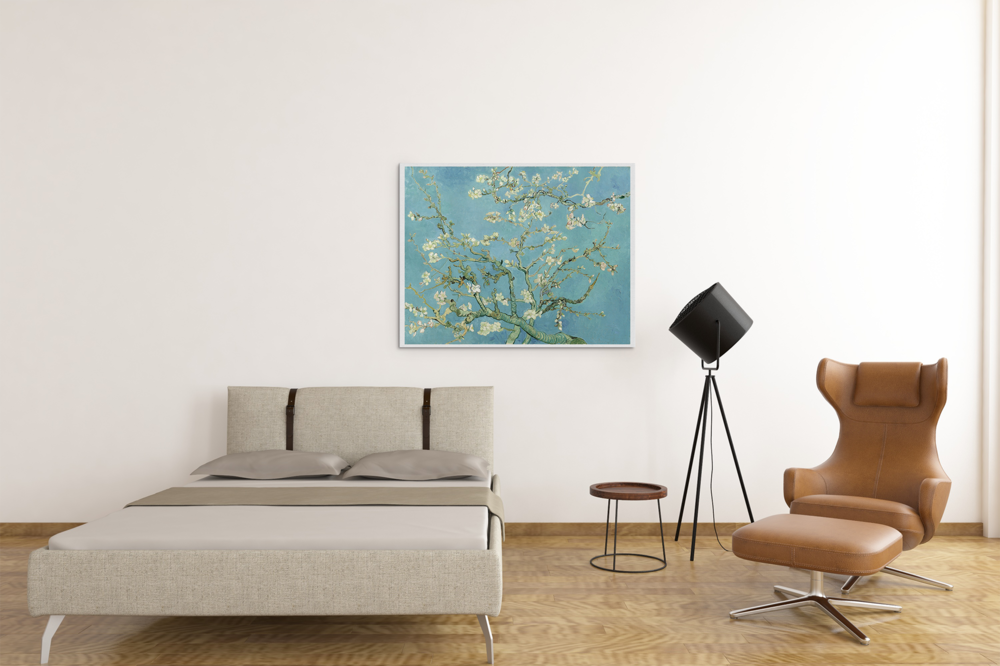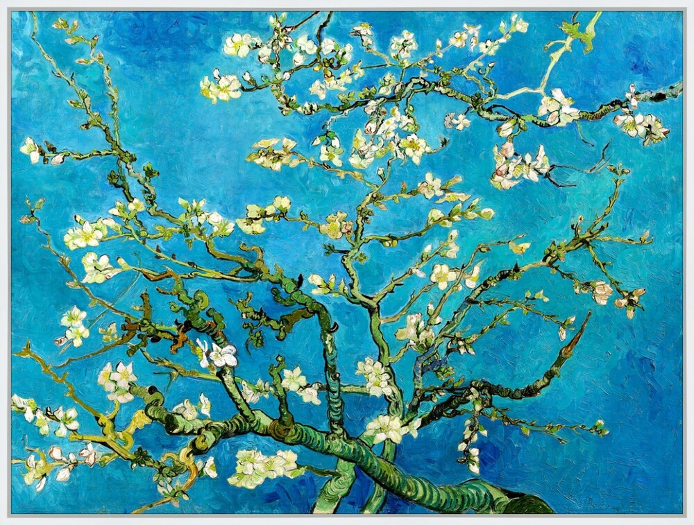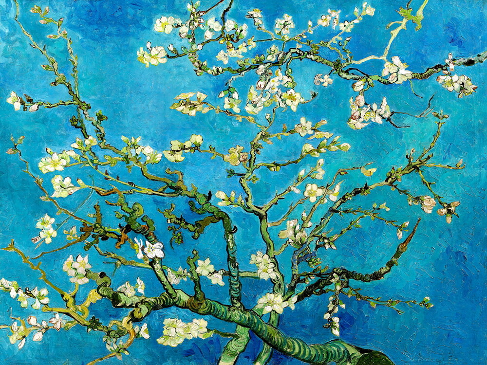 푸른 하늘을 배경으로 하얀 꽃이 만발한 아몬드 나무는 고흐가 탄생시킨 기적과 같습니다. 가장 힘든 상황에 있을 때 자신의 어떤 작품보다도 안정적인 행복을 그려냈기 때문입니다.